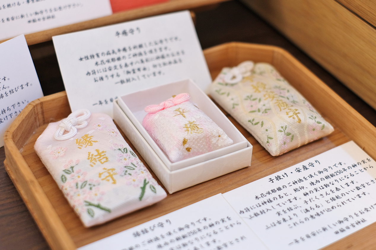 病気平癒や子授け・安産、縁結びなどの御守りは優しさを感じるデザイン。子授け・安産守りの中には、樹齢250年になる境内の榊の実が入っています。榊は実が鈴なりになることから子だくさんの象徴とされているそうです。
