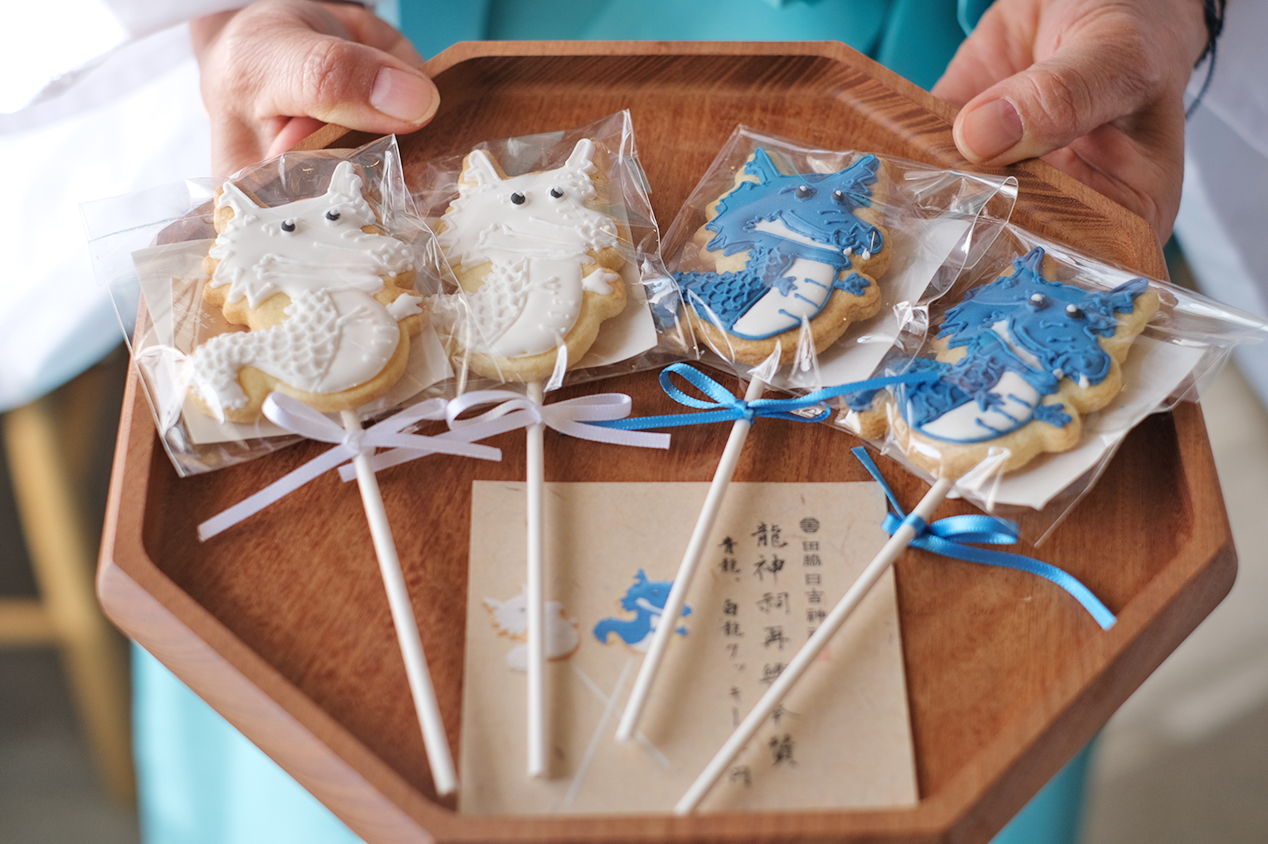 かつては現在の土地のすぐそばまで海があり、神社創建前から龍神信仰の拠点になっていたことから、龍神様の祠の再建も計画されています。そのことを広めるために1月末まで頒布されている「龍神クッキー」(各1,000円)も可愛らしいですね。