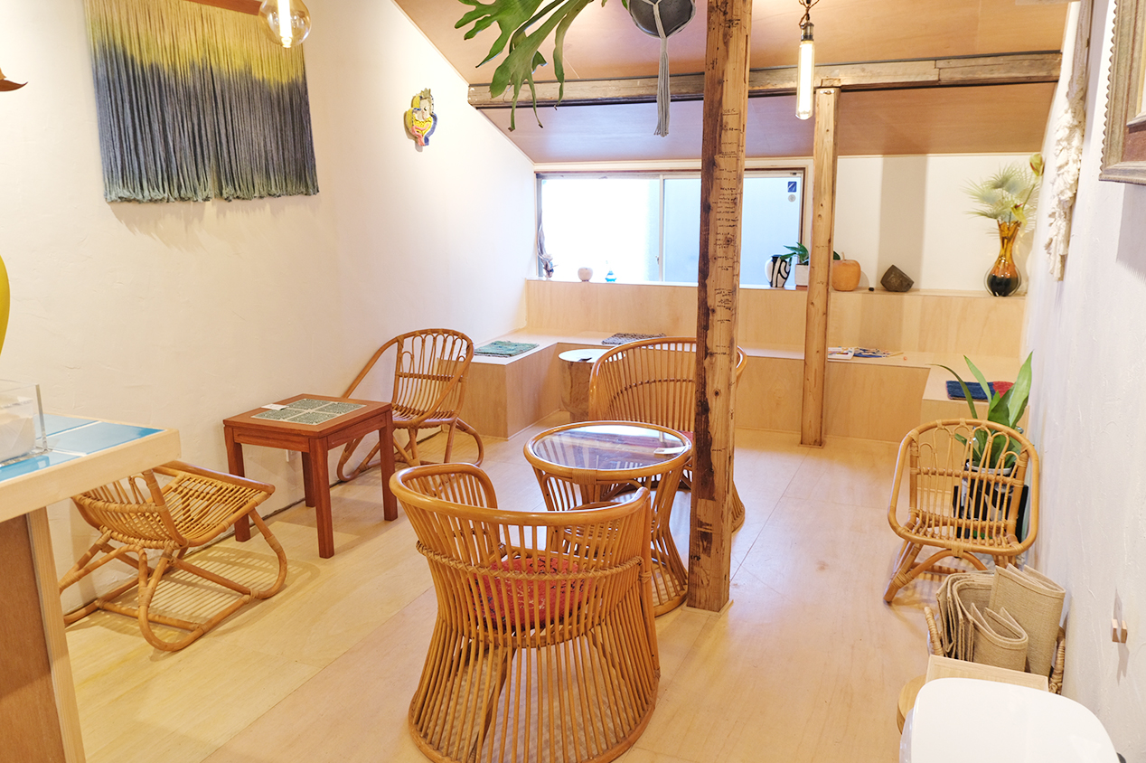 古い長屋を改装した店内には、もともとの柱や梁を活かした味わい深さのなかに、ヴィンテージ家具やアート作品などを配したセンスあふれる空間が広がります。クレープのイートインも可能です。