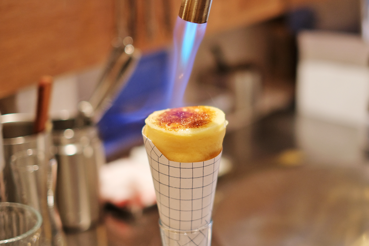 生クリームとアイスクリームのベースにアクセントのタルト生地、アーモンドプラリネを加えカスタードをプラスして、表面をキャラメリゼした「クリームブリュレ」(800円)。カリッとした食感の香ばしいブリュレとまろやかなカスタード、冷たいアイスクリームが調和した人気メニューです。
