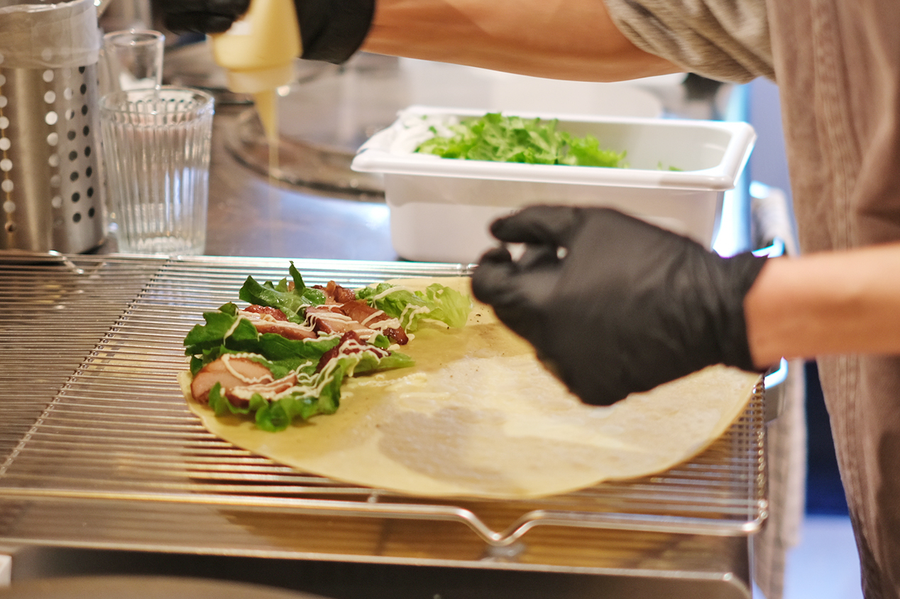 食事系メニューの「テリヤキチキン」(750円)は、モチモチ生地とレタスのシャキッとした食感、照り焼きチキンの食べ応えを楽しめる一品。食事系はほかにも「ツナたまご」(750円)や「ハムチーズ」(700円)がメニューに並びます。