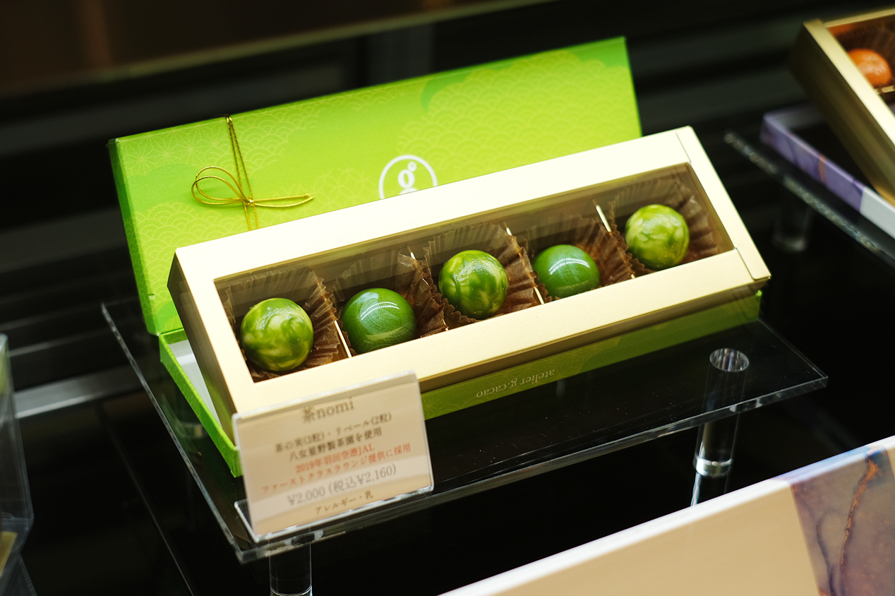 また、羽田空港のJALファーストクラスラウンジのスイーツとして採用された「茶nomi」(5個入り 2,160円)も松尾さんを代表するチョコレートです。