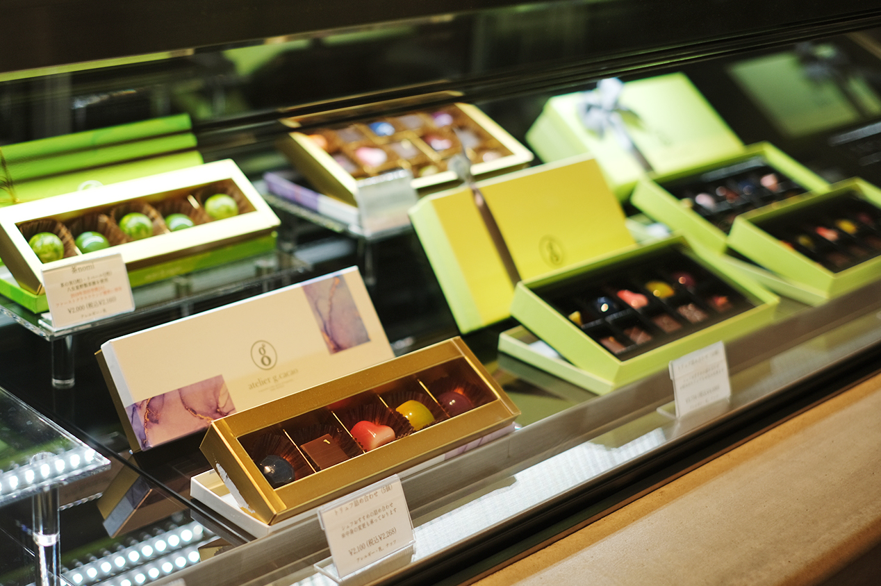 店内は、主役のチョコレートを引き立てるためにシンプルな造りになっていて、ショーケースにはアートピースのようなボンボンショコラが並んでいます。
