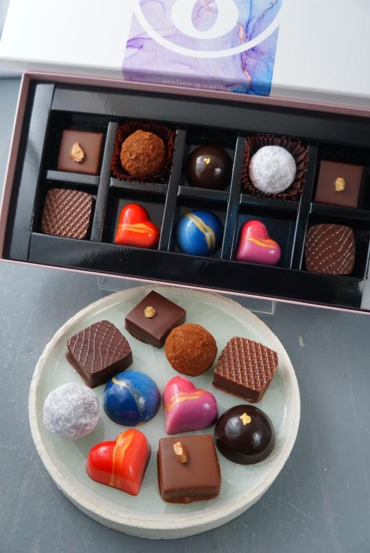 コーティングの薄いチョコレートやクリーム、フルーツジュレ、キャラメルなどが口の中で溶けあう繊細な味わいのチョコレートを食べるのは「至福」のひと言。一つひとつの味わいや香りの違いを楽しみながら大切に味わいたくなるおいしさです。