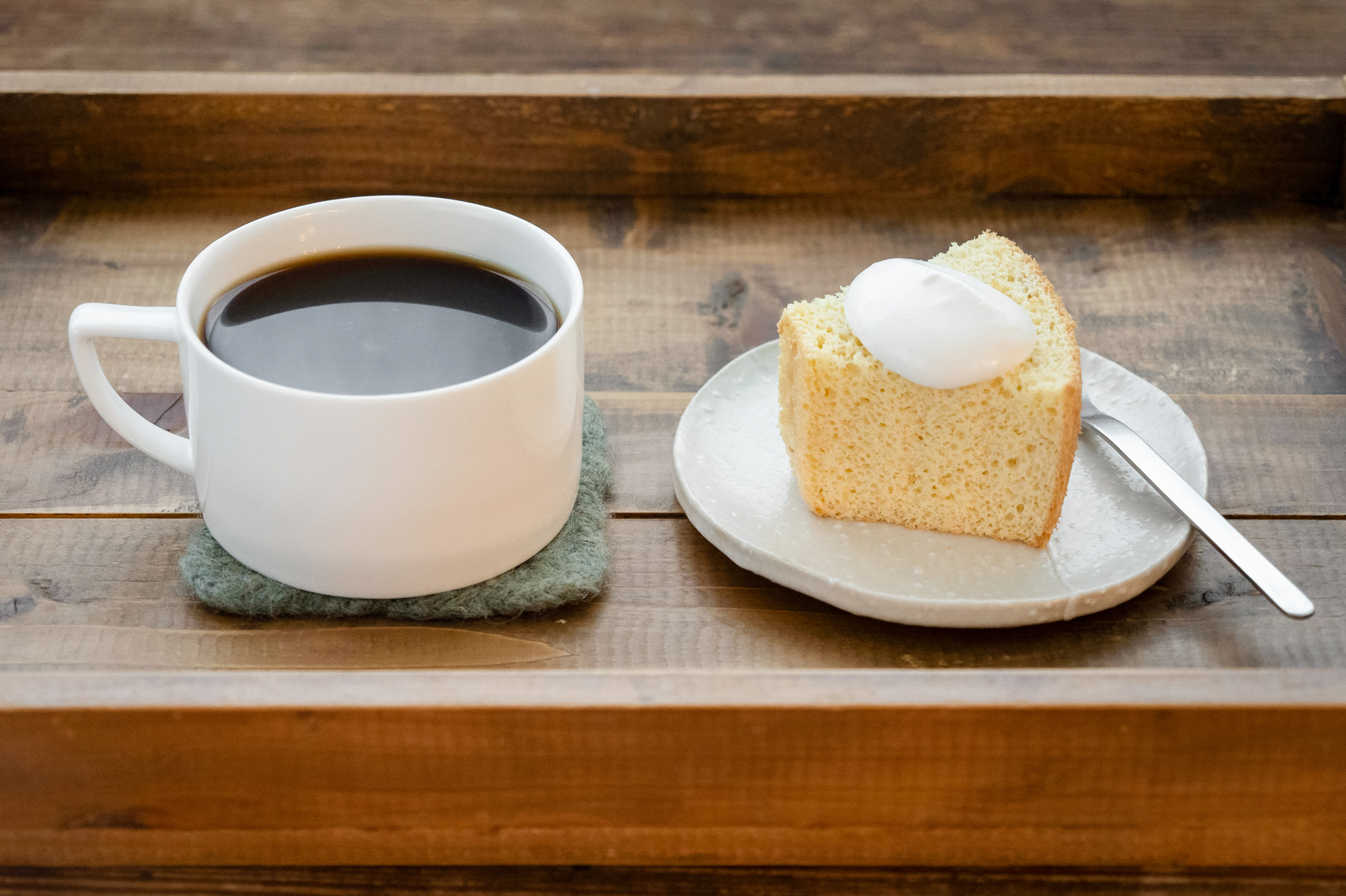 ランチセットには、プラス300円で食後のドリンクとおやつのセットも追加できます。取材時にはフェアトレードのオーガニックコーヒーとミニサイズの柚子シフォンケーキをいただきました。米粉100%で作るシフォンケーキはしっとりきめ細やかな舌触り。テイクアウトも可能です。