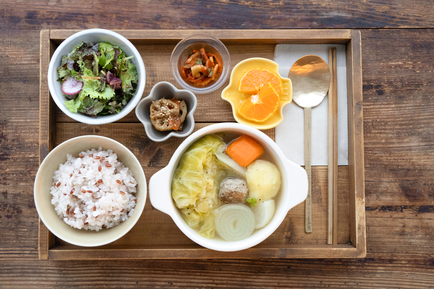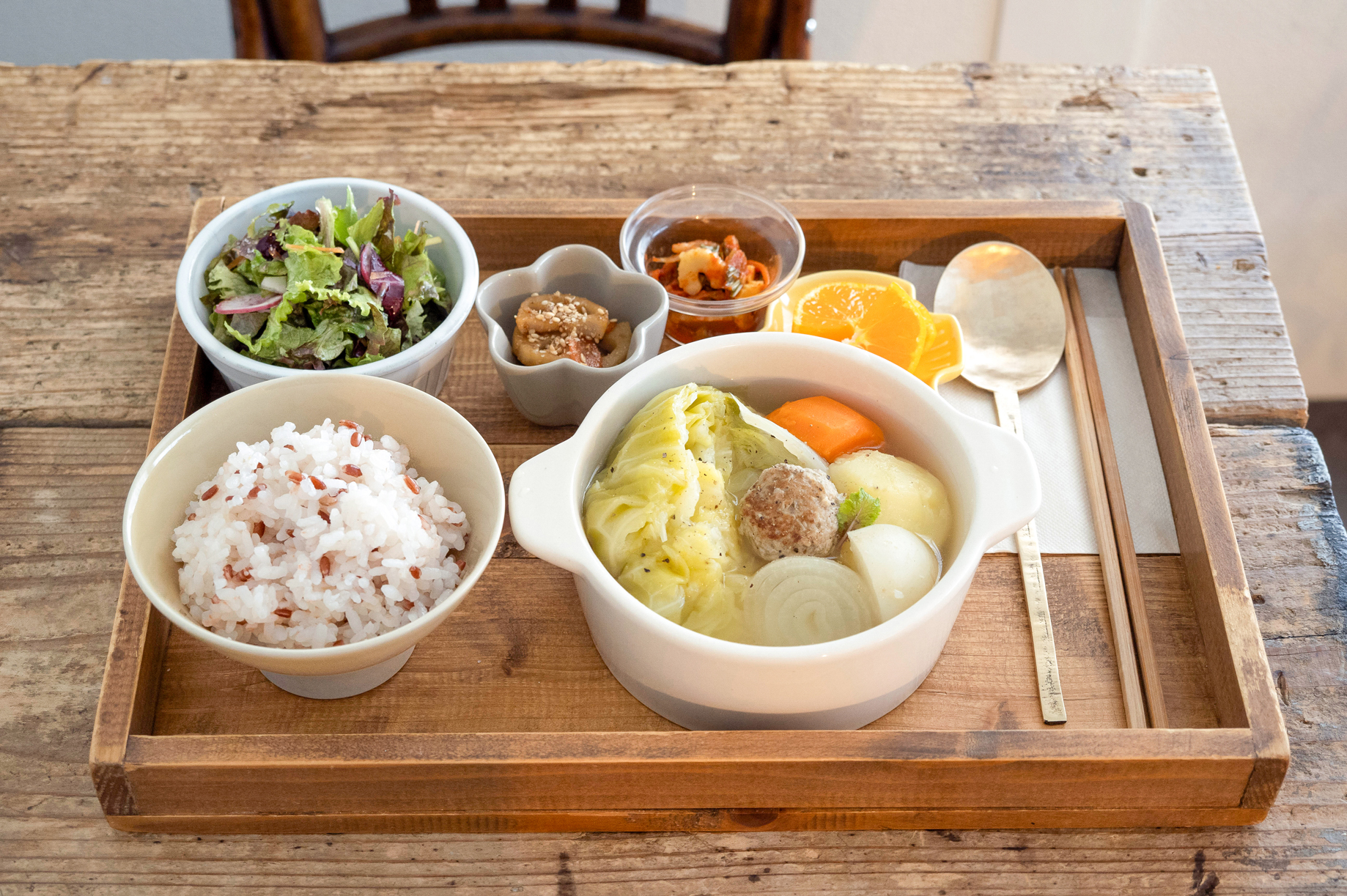 ランチセット(1,200円)は「お野菜ごろごろポトフ」「糸島豚の煮込みハンバーグ」「薬膳カレー」の3種類で、取材時はポトフを注文しました。リーフサラダ、日替わりの小鉢、果物がセットになっています。