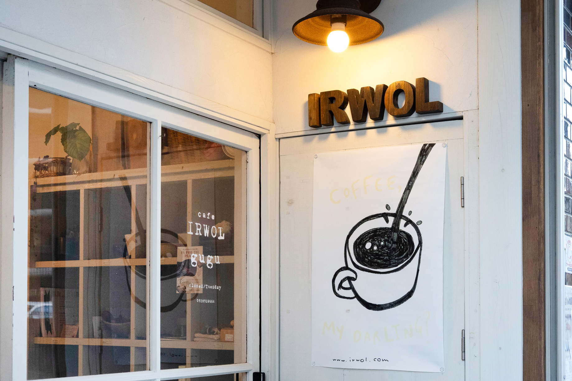 「cafe IRWOL」は2013年に愛宕神社に程近い場所で創業し、その後2021年12月に現在の場所へ移転。古い2階建ての建物を改装したレトロな雰囲気で、茶色いタイルの壁とコーヒーの看板が目印です。