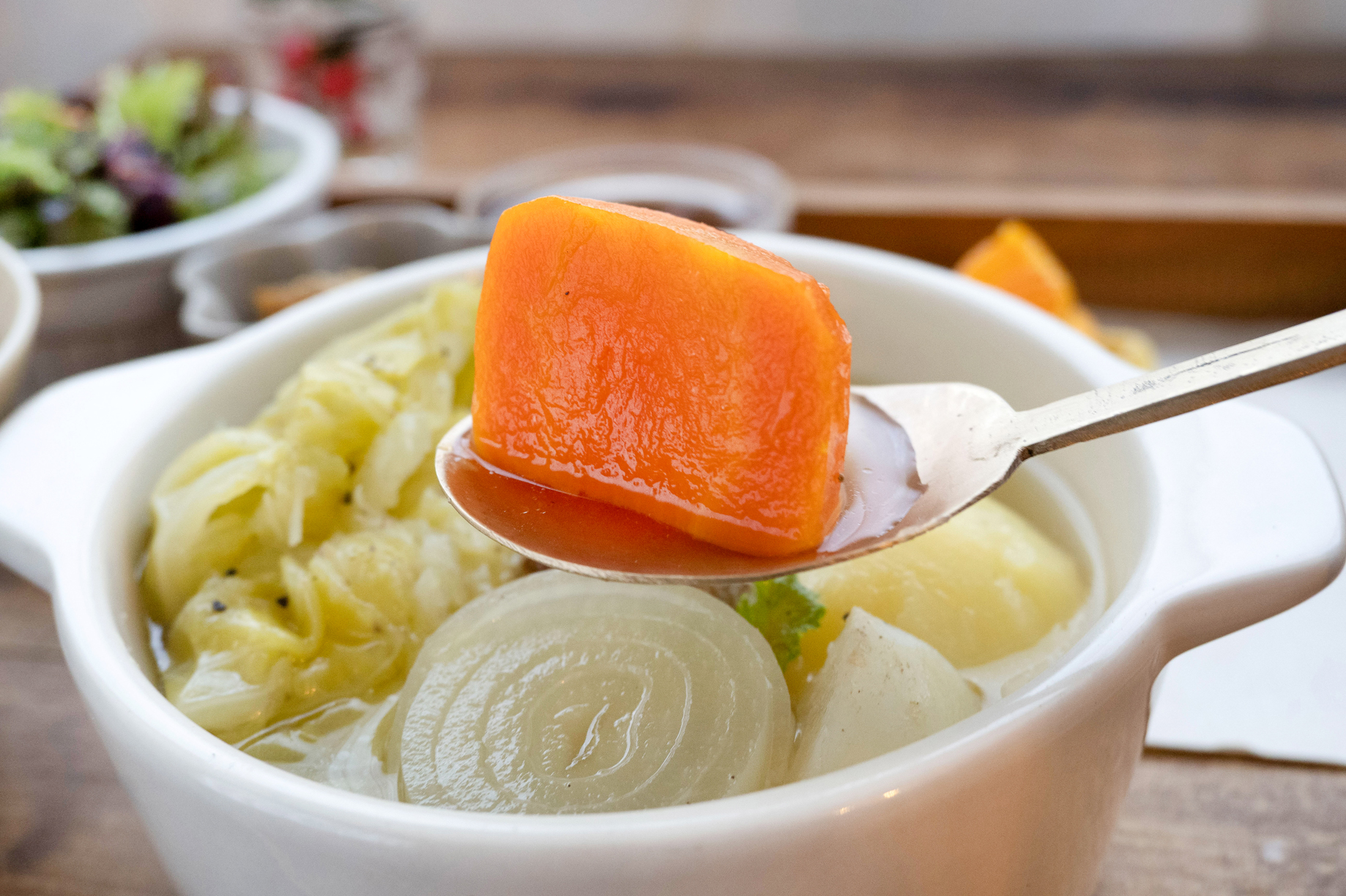 主役となる野菜は、糸島や朝倉、久留米など福岡県産の無農薬、減農薬野菜を中心に厳選。キャベツ、タマネギ、ニンジン、ジャガイモは定番で、そこにカブやフェンネルなどの季節野菜が加わります。栄養成分の多いミネラルウォーターで煮込まれたポトフは、心とからだがほっと温まる優しい味わい。ブイヨンなどの出汁は使わず、沖縄の塩のみで味付け。シンプルだからこそ、野菜の香りや甘味、奥深いうま味が染み渡ります。