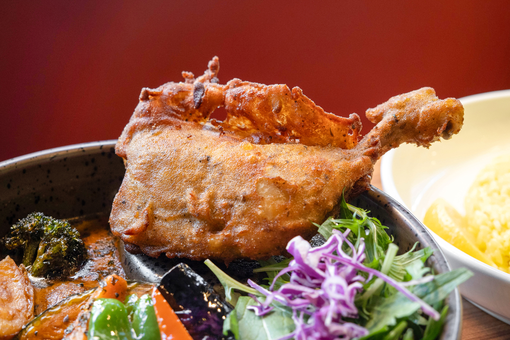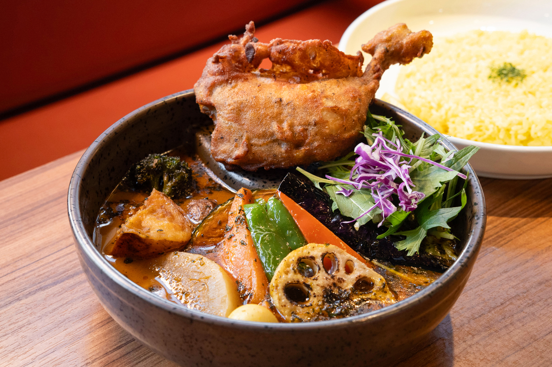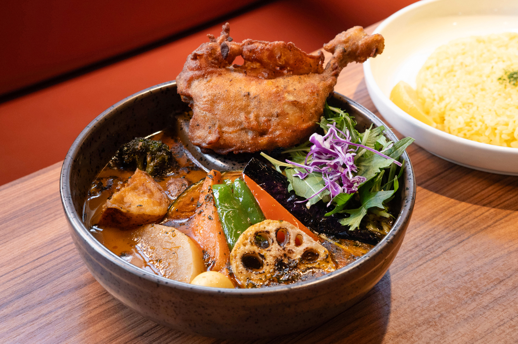 骨付きのチキンレッグは下味を付けてからじっくりと炊き、注文ごとに揚げているそう。衣はサクサクなのに、身はホロッとほどけるほどに柔らかく食べ応えも満点です。「まずはパリッとした食感を楽しんでもらえるように」と、スープが浸らないように“メイン具材をのせる場所だけ”底上げされた有田焼の特注皿を使用するこだわりも。