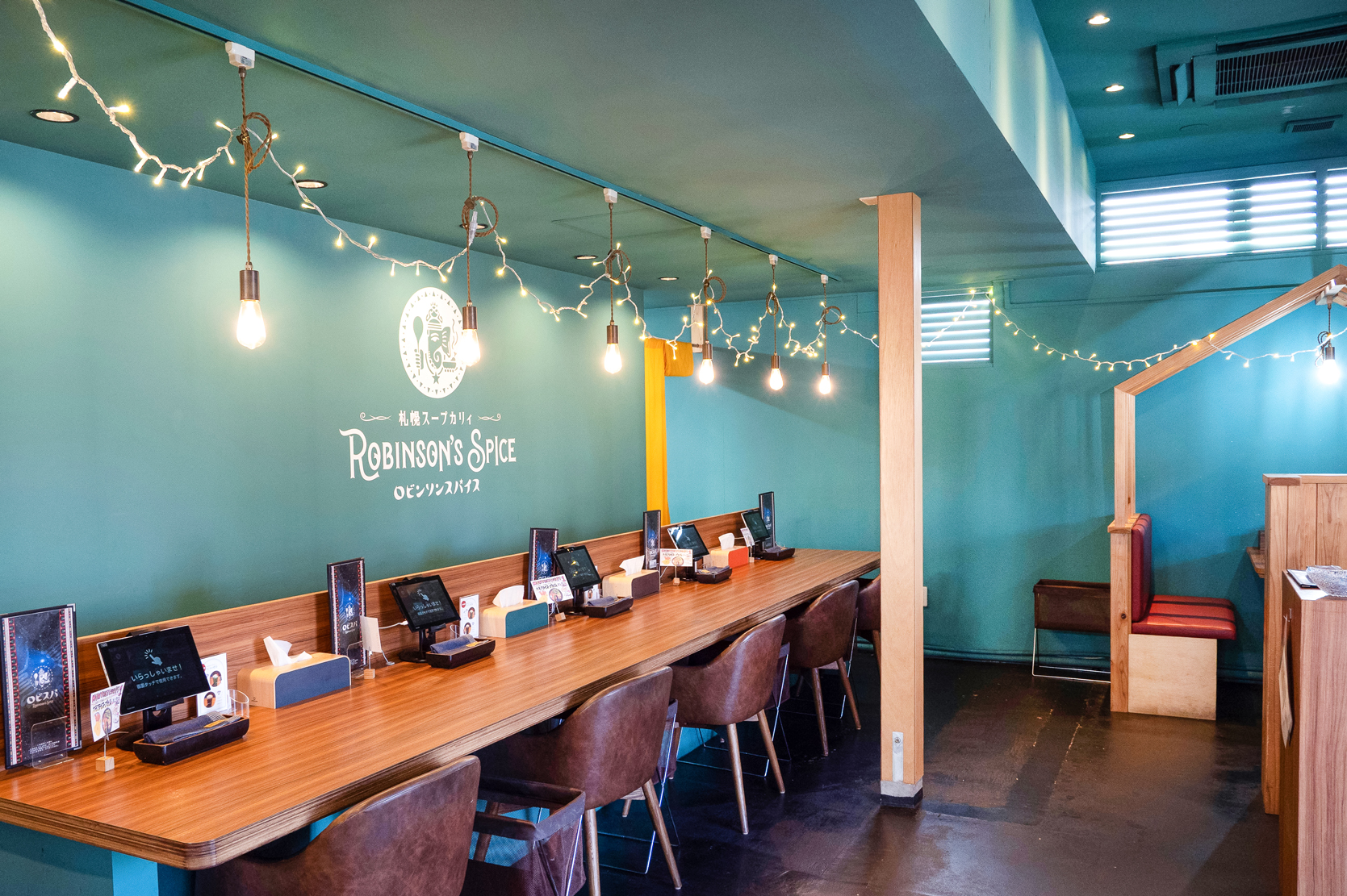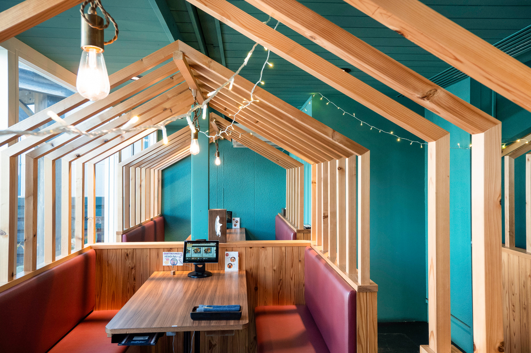 約48席を有する店内は、ターコイズブルーを基調としたポップで明るい雰囲気。入口側にはカウンター席、奥には家族連れやグループでくつろげるテーブル席とベンチシート席が用意されています。