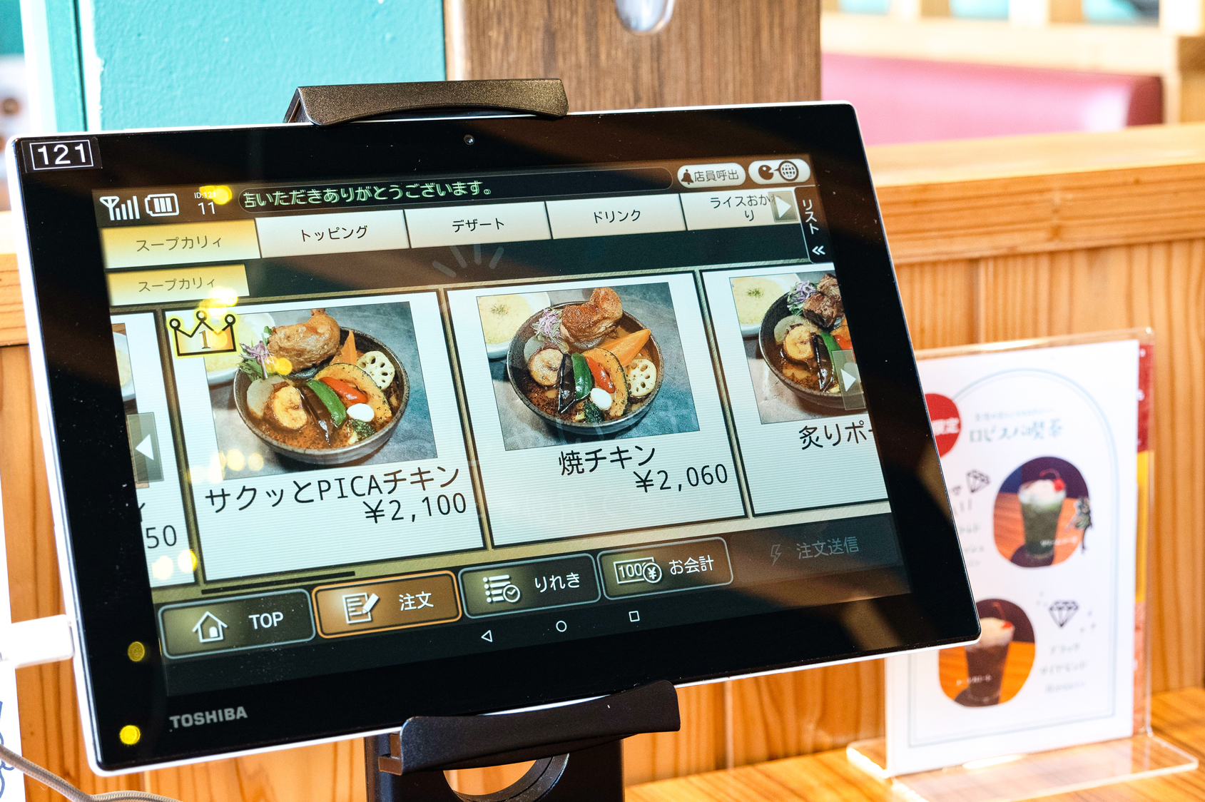 席に着いたら早速、卓上にあるタッチパネルから注文。スープカレーの基本具材は12種類の野菜とうずらの卵で、そこにチキンやハンバーグなどのメイン具材が添えられます。まずは10種類の中からメインを選び、次に5種類の中からスープをチョイス。辛さは1から40レベルまで選択でき、ライスの量も「なし」から「ピラミッド(1kg)」(+560円)まで調整できます。