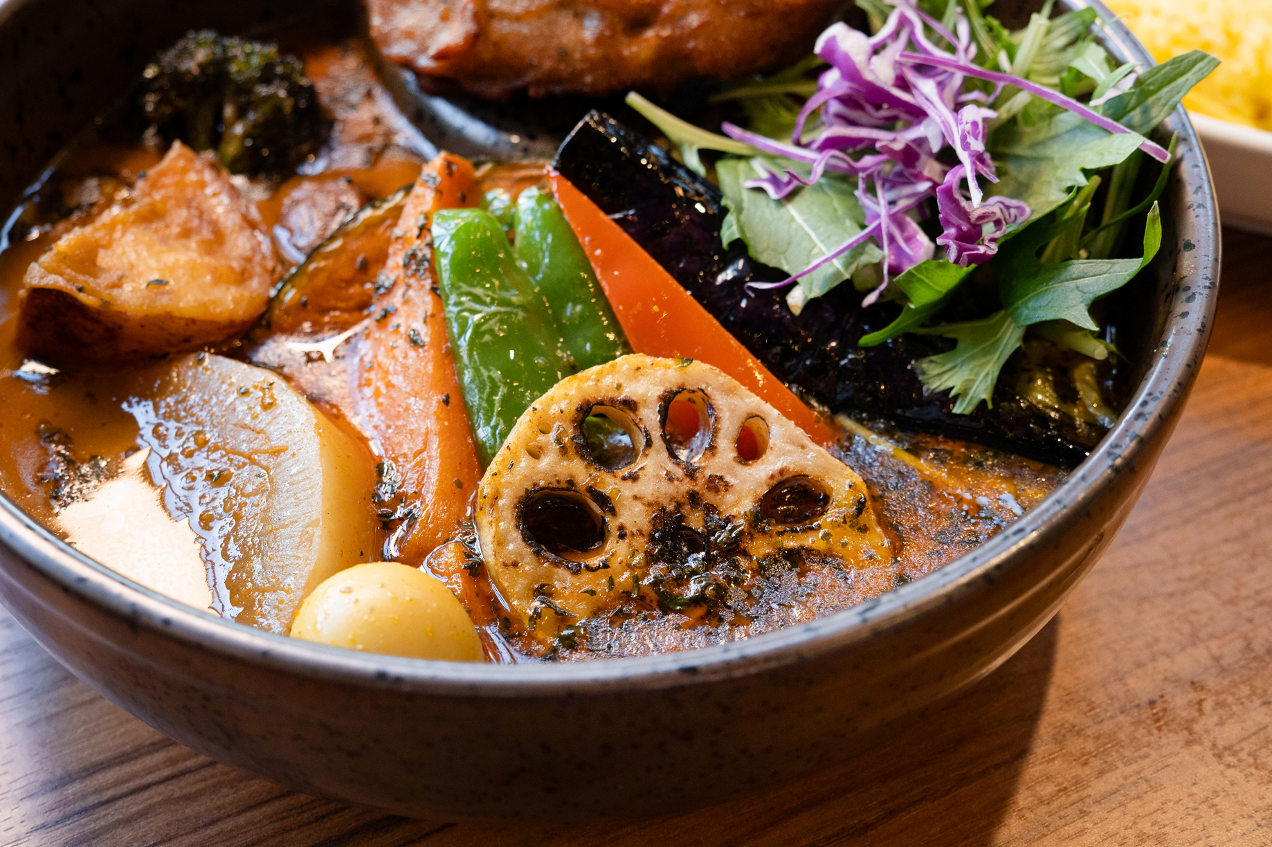 彩り豊かでゴロッと大ぶりな野菜も本場・札幌のスタイルそのままです。キャベツ・ピーマン・パプリカ・ナスはサッと油通し、カボチャ・レンコンは蒸して、ジャガイモは蒸した後に油で揚げ、ニンジンや大根はスープで別炊きするなど素材に合わせて調理。シャキッ、ホクホク、ジュワリと、それぞれの食感や滋味が口いっぱいに広がります。