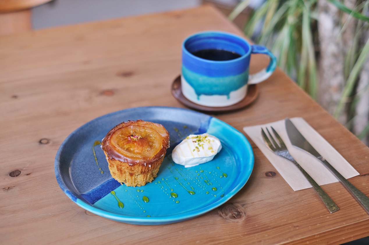 「本日のケーキプレート」(880円)とセットドリンクのコーヒー(+400円)。この日は瀬戸内レモンを使ったカップケーキに生クリームが添えられ、キャラメルソースがかかっていました。小麦の香りや爽やかなレモンの風味など、素材の味をしっかり感じるカップケーキは、ほかの季節のものも食べてみたくなるおいしさ。コーヒーはそばにある「オセロ スペシャルティ コーヒーロースター」に依頼したオリジナルブレンドです。使い心地を試すことができるので、器選びの前に利用するのもいいですね。