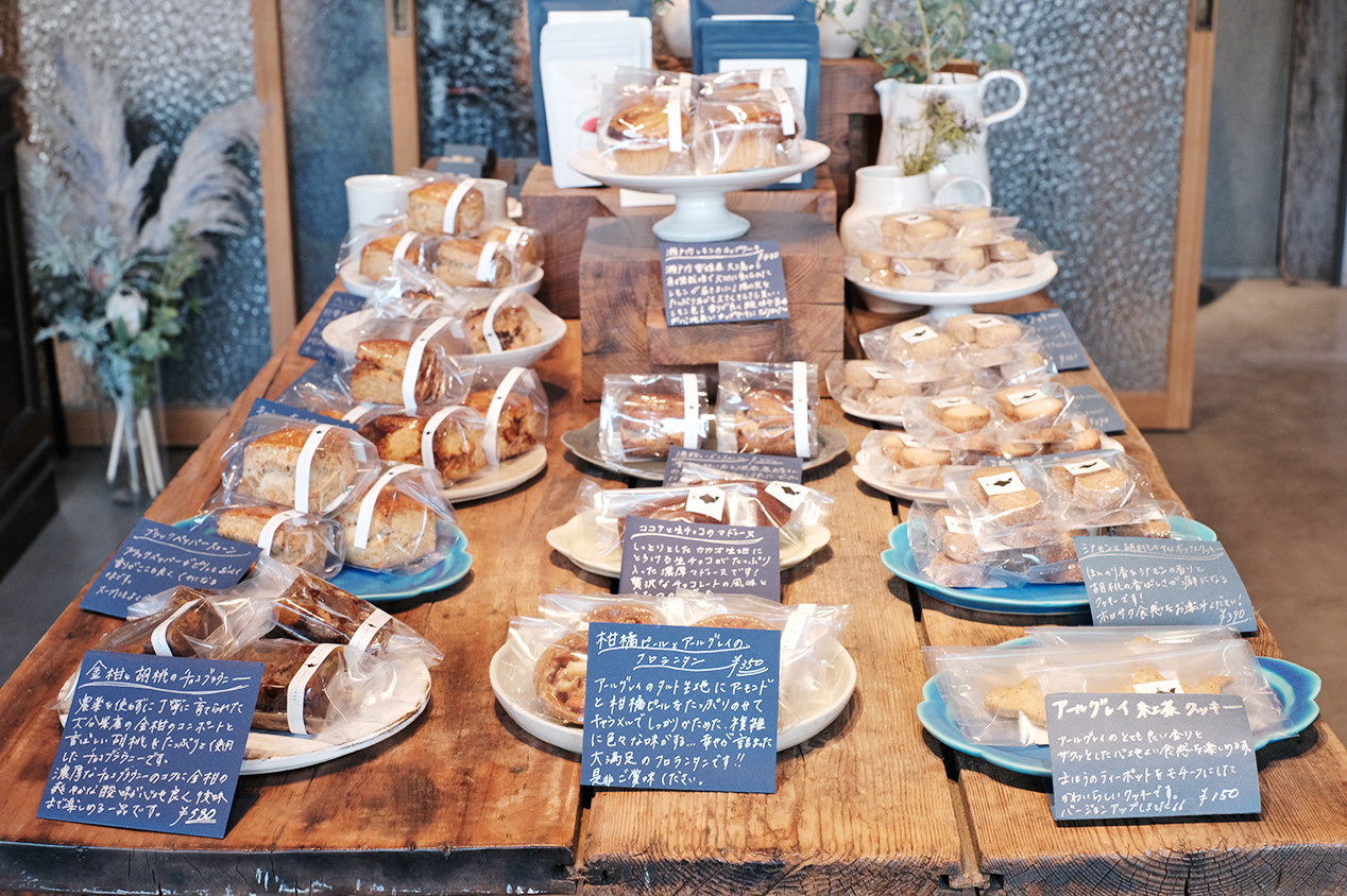 焼菓子は、杵築産の小麦粉や大分県産のフルーツなど地元の素材を中心に、添加物を使わずに作られています。その時々によって内容は替わり、特に季節の素材を使ったカップケーキが人気です。