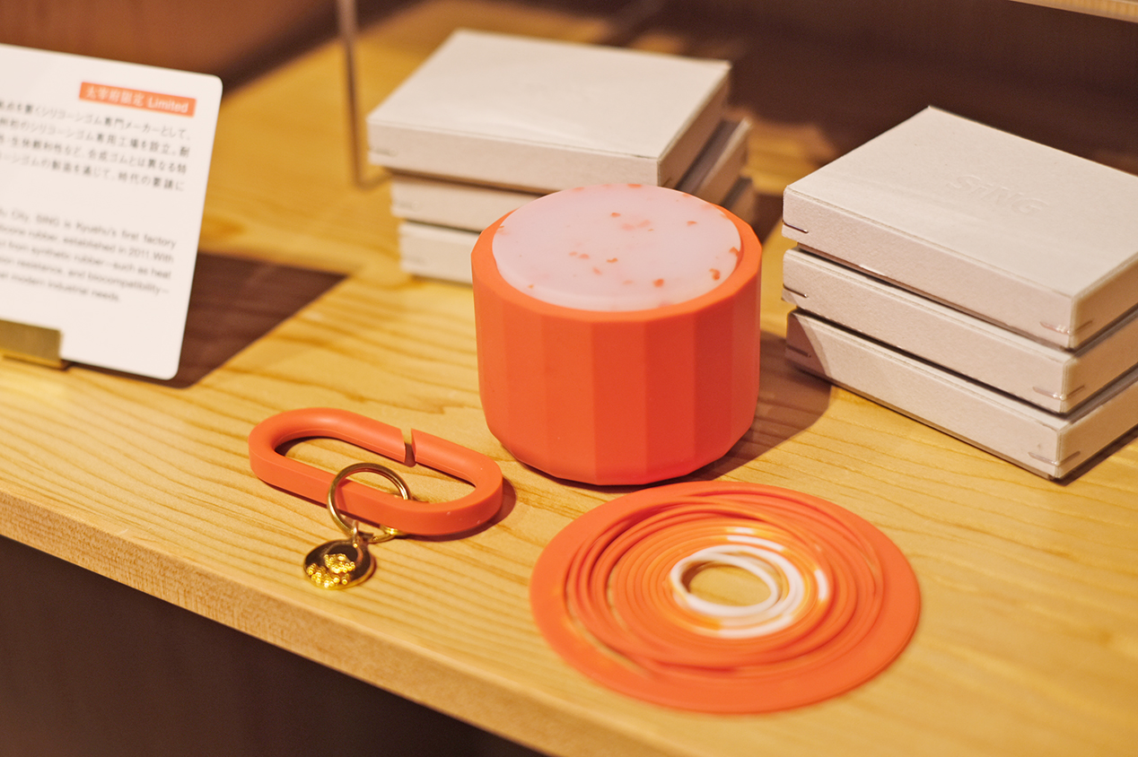 太宰府市のシリコンゴムメーカー「SiNG」のキーホルダーやカップも太宰府店限定のアイテム。「BEAMS」のブランドカラーであるオレンジ色(橙色)がポップな印象です。