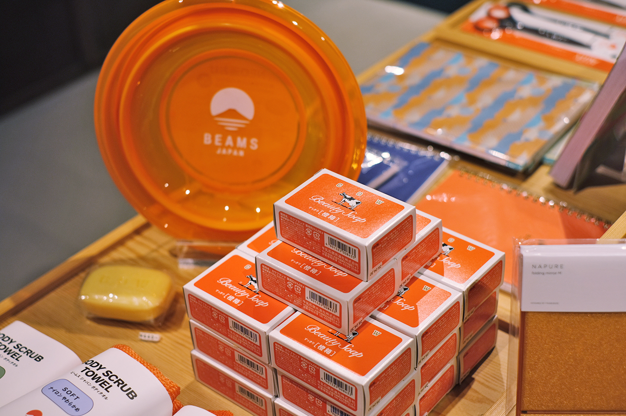 信楽焼のたぬきや「牛乳石鹸」などの長く愛されるアイテムも「BEAMS」カラーのオレンジ色(橙色)になると新鮮に感じます。