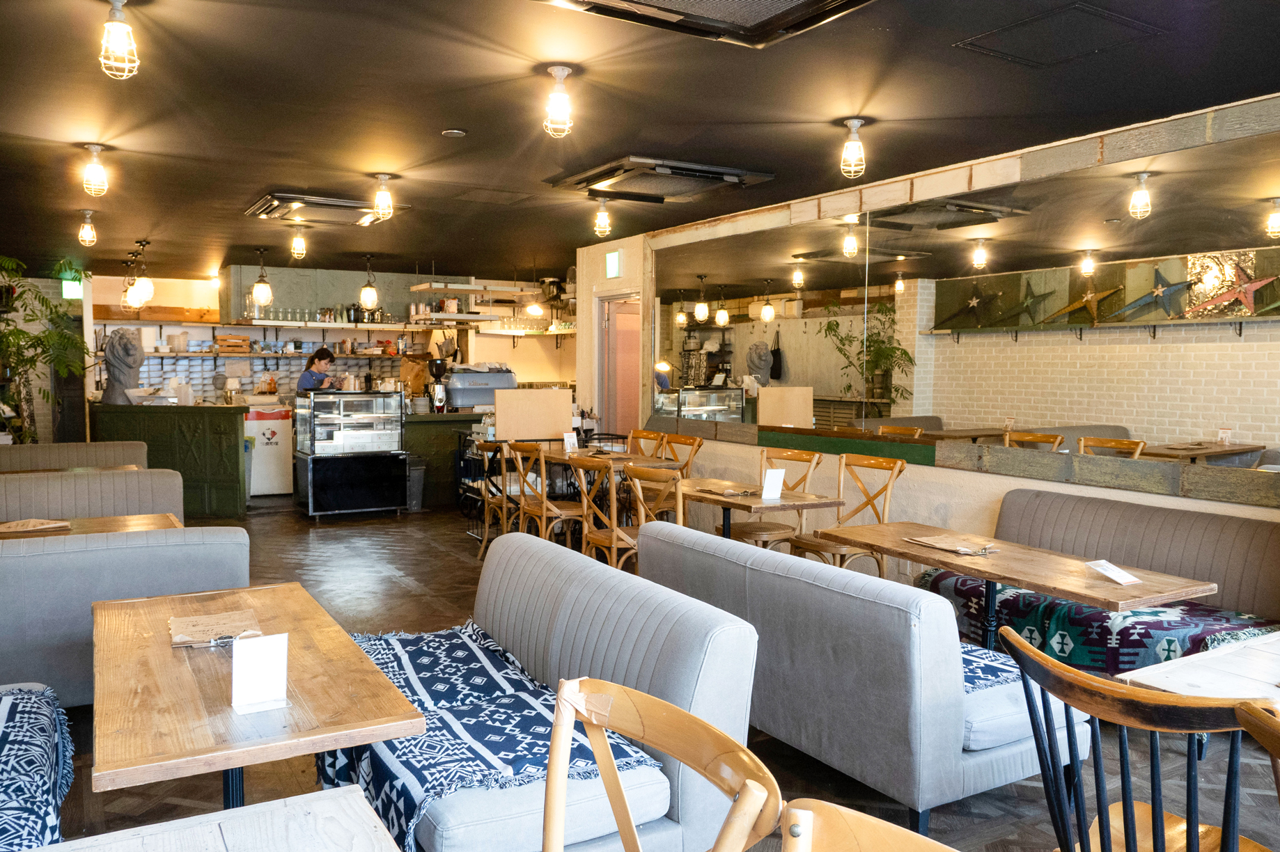 木のナチュラルな風合いを生かした店内は広々と開放的。ゆったりとしたソファ席や陽の光が差し込む屋根のあるテラス席もあり、居心地の良い空間が広がっています。