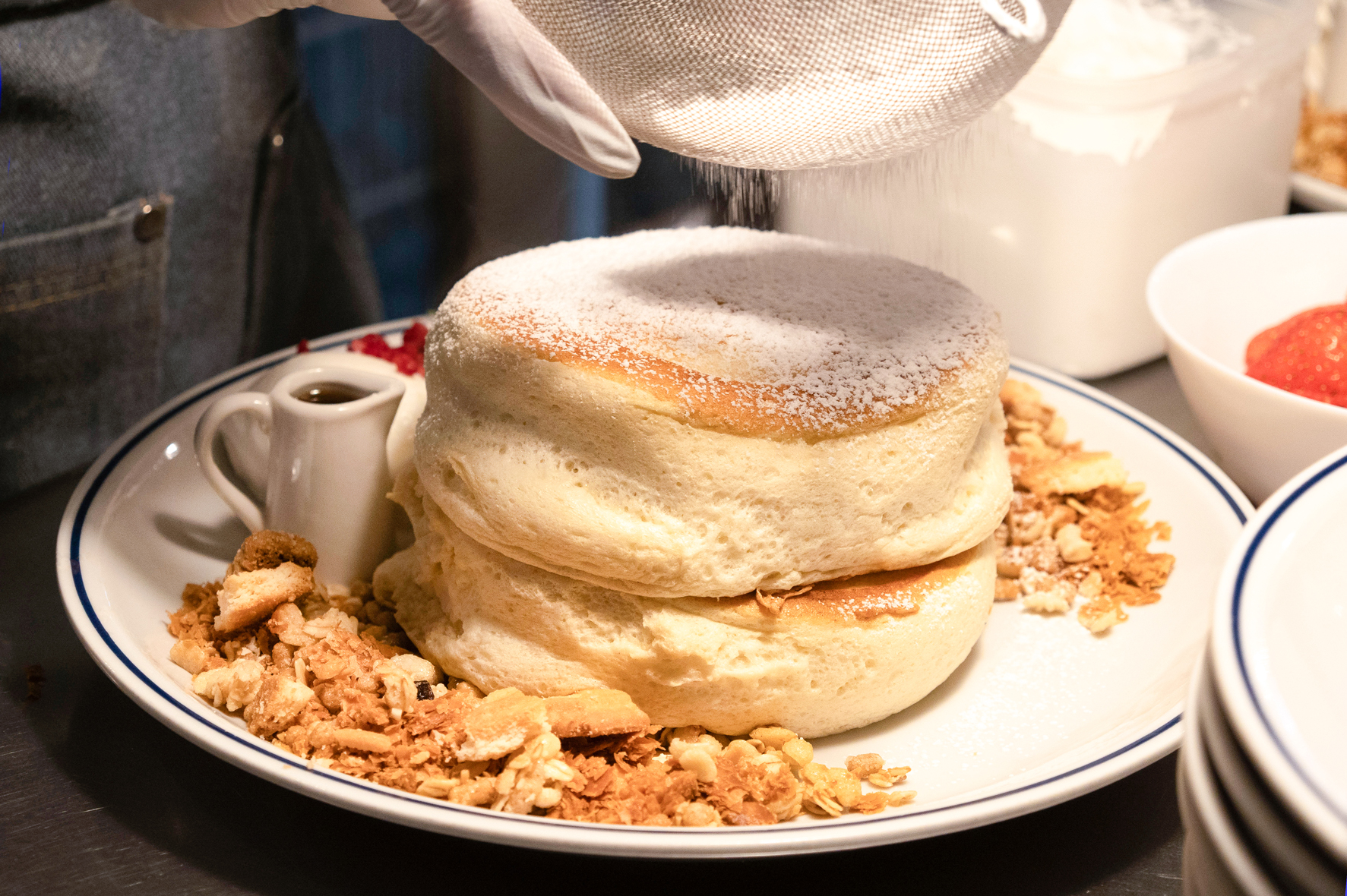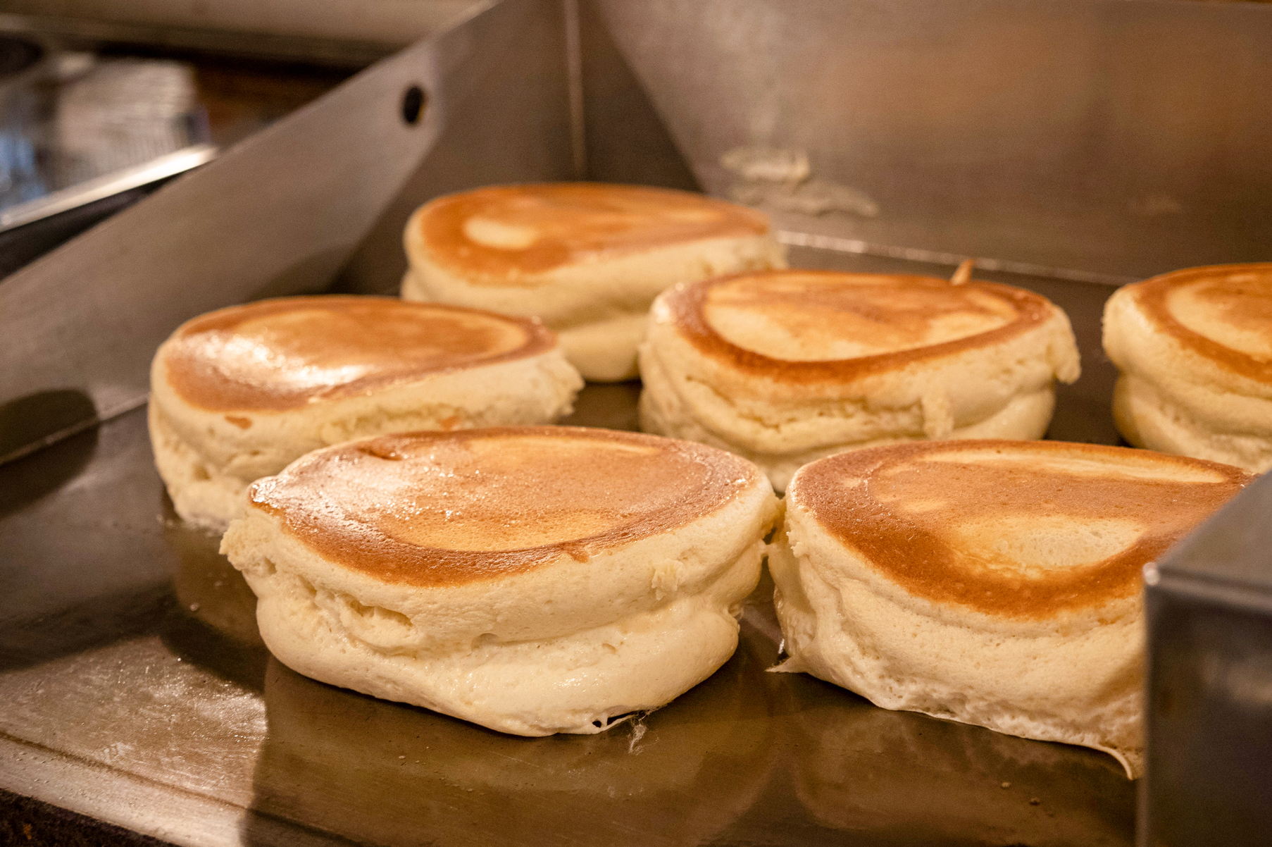 「Cafe del SOL」のパンケーキは、ふわふわのスフレスタイル。卵白をしっかりと泡立ててメレンゲを作り、そこへ研究を重ねて独自に配合したパンケーキの粉を混ぜ合わせ、鉄板で静かに焼き上げるのがおいしさの秘密です。
