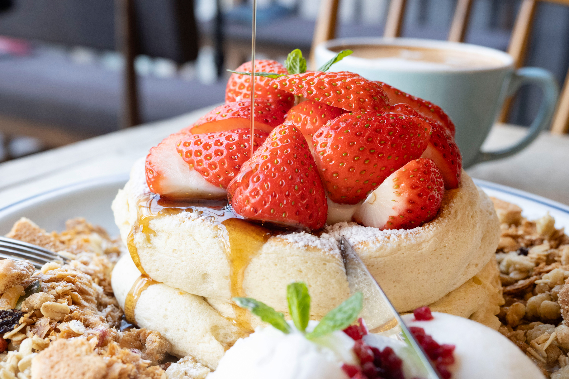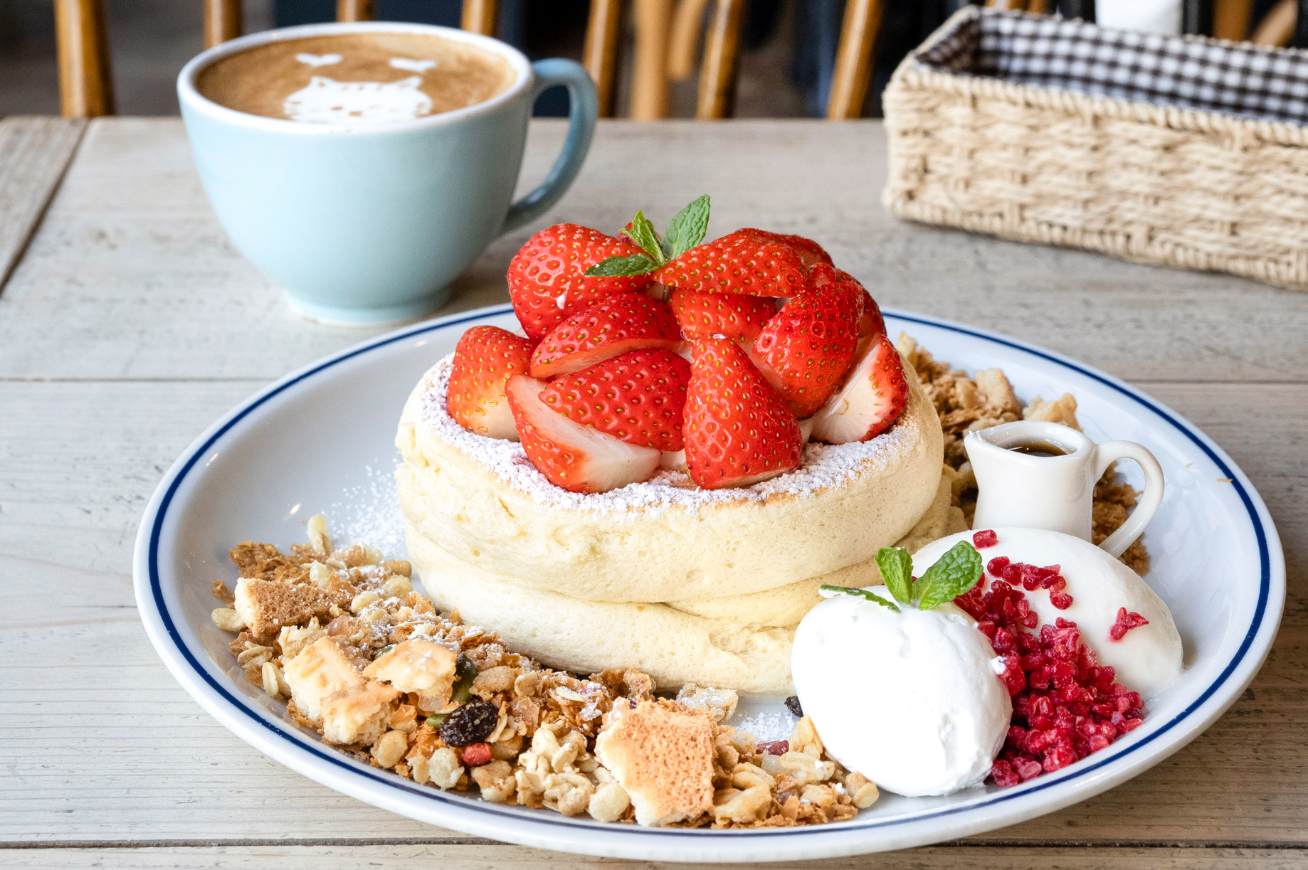 取材時にいただいたのは「たっぷり苺のふわふわパンケーキ」(1,980円)。2段重ねしたパンケーキの上には、フレッシュないちごがふんだんに。横にはヨーグルト入りの軽やかな生クリームとミルクジェラート、グラノーラやクッキーを砕いたクランチ、甘酸っぱいラズベリーが添えられています。