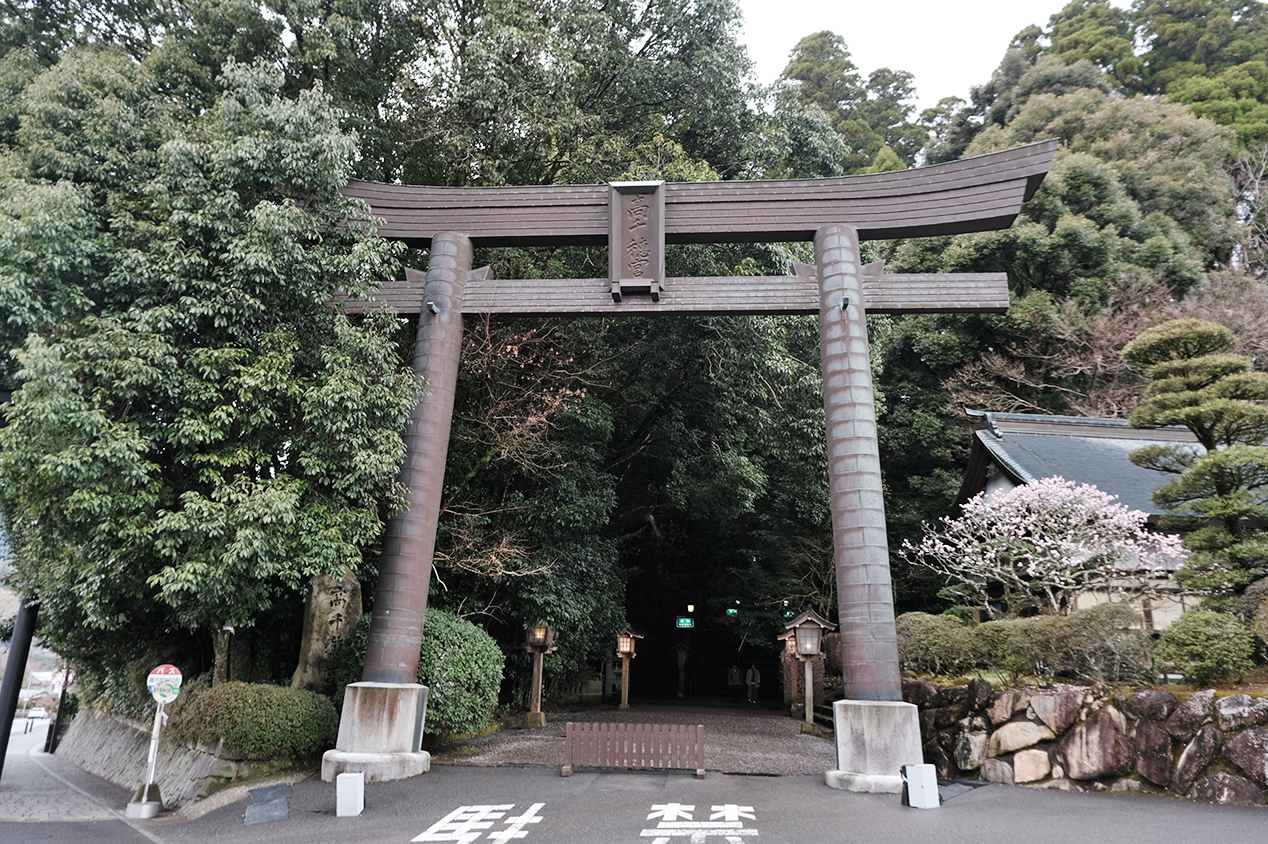 「高千穂バスセンター」から徒歩10分ほどのアクセスのいい場所にあります。通り沿いにそびえ立つ銅製の大鳥居の先に、清々しい空気に包まれた境内が広がっています。