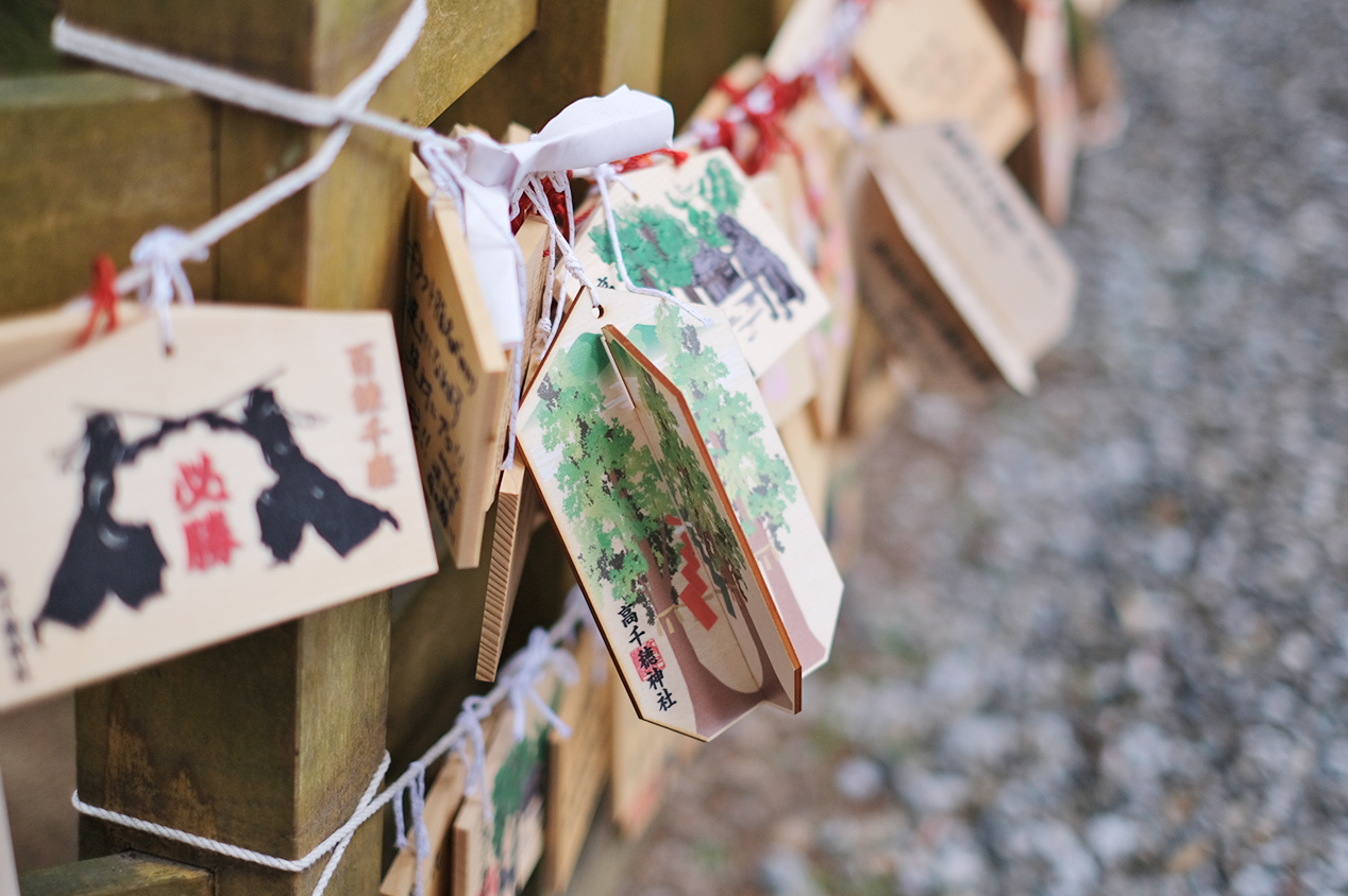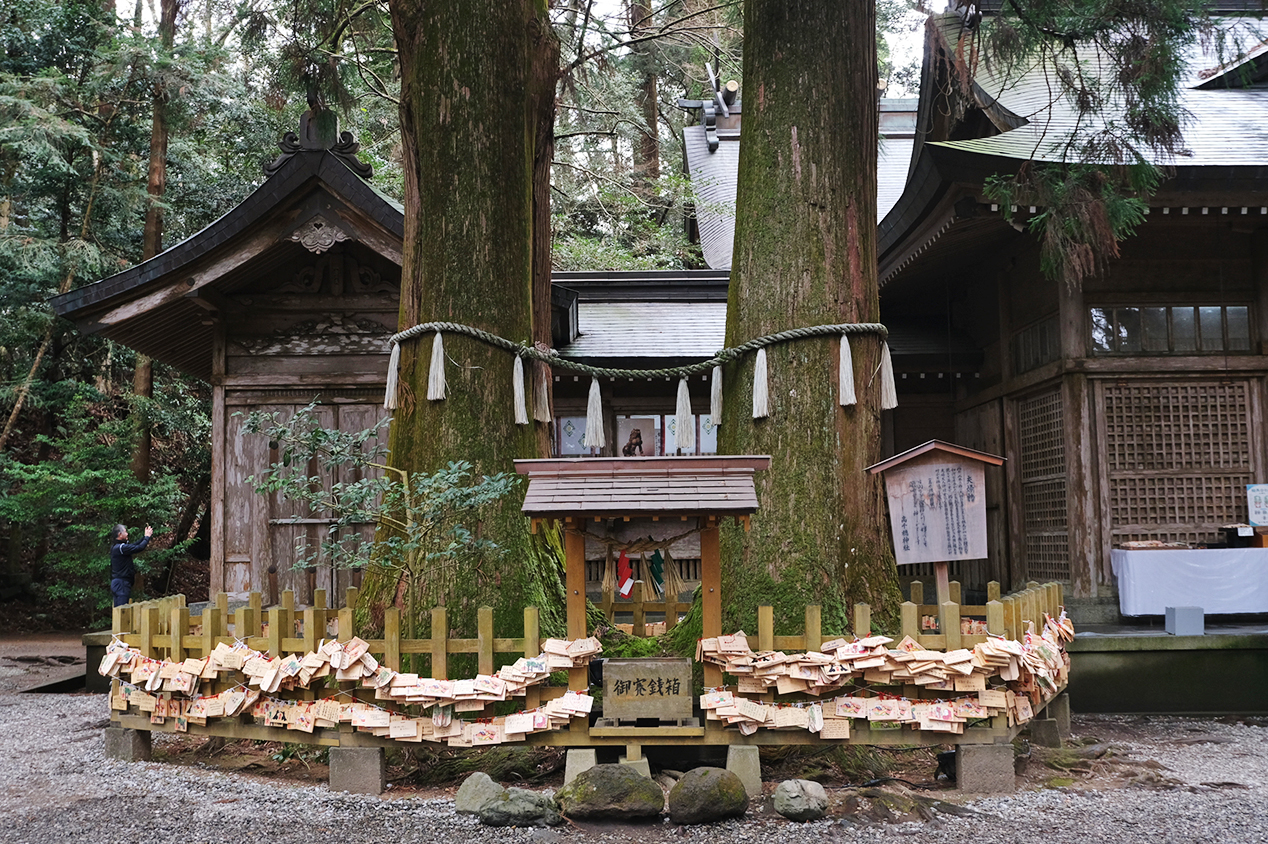 夫婦杉の周りには絵馬をかけることができます。ふたりの願い事を組み合わせて完成する夫婦杉をモチーフにした絵馬もありました。
