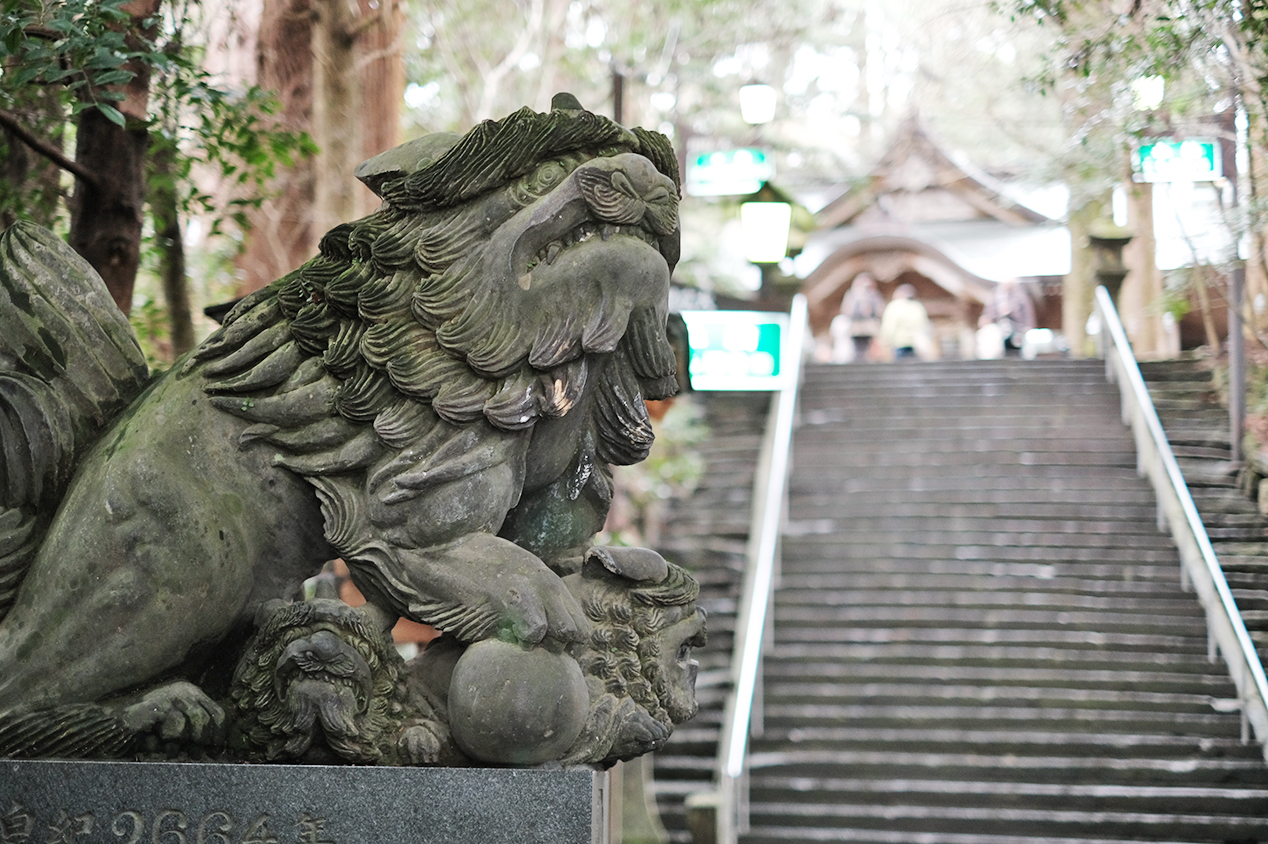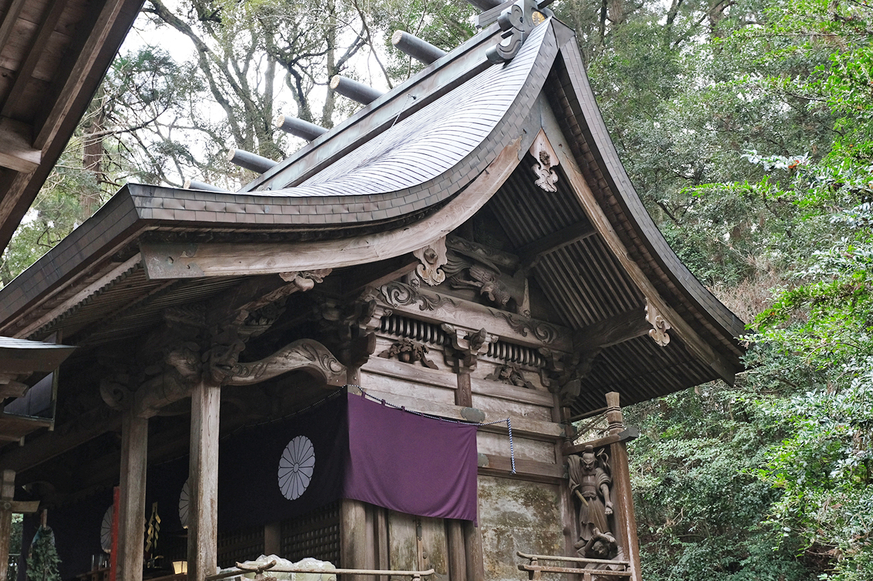 御本殿は、江戸時代の1778年に延岡藩主により造営されたもので、こちらも国重要文化財に指定されています。鬼を退治する三毛入野命や動物、花々などの彫刻も見どころのひとつです。