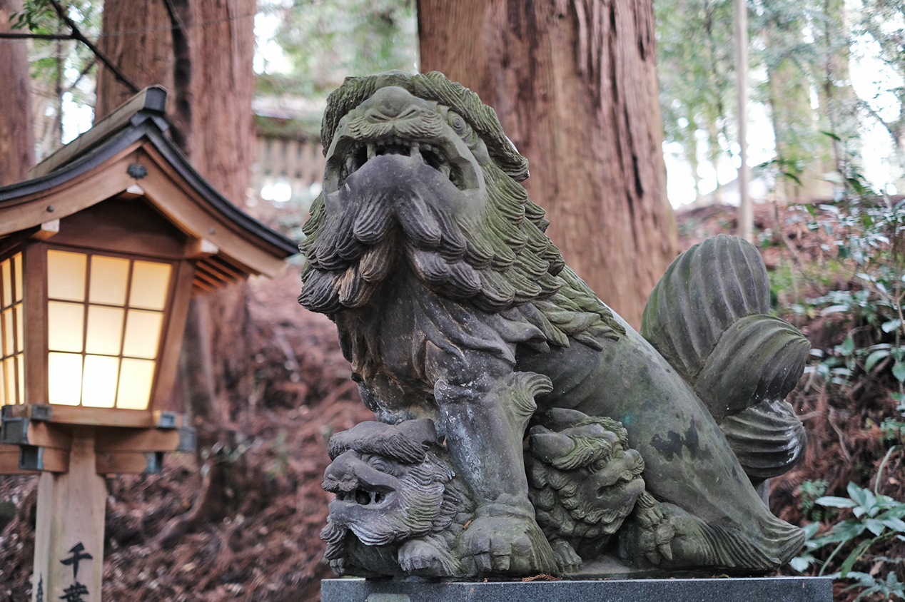 参道の狛犬は、小さな子を抱えためずらしいもの。縁結びや家内安全の神さまらしさを感じますね。