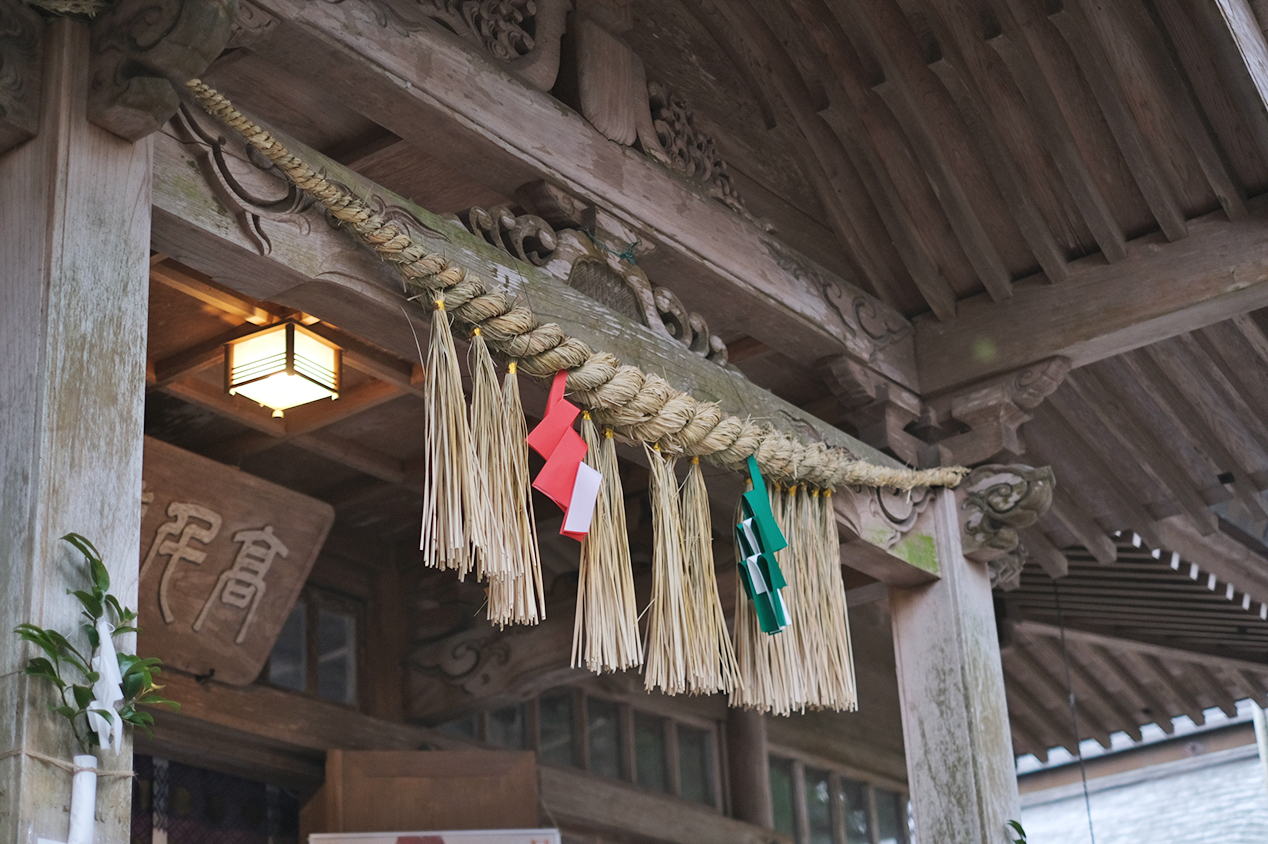 拝殿などに掛けられているしめ縄の紙垂はめずらしい青(緑)と赤。青は天と水、赤は地と火を意味し、世の中の森羅万象を表しているそうです。