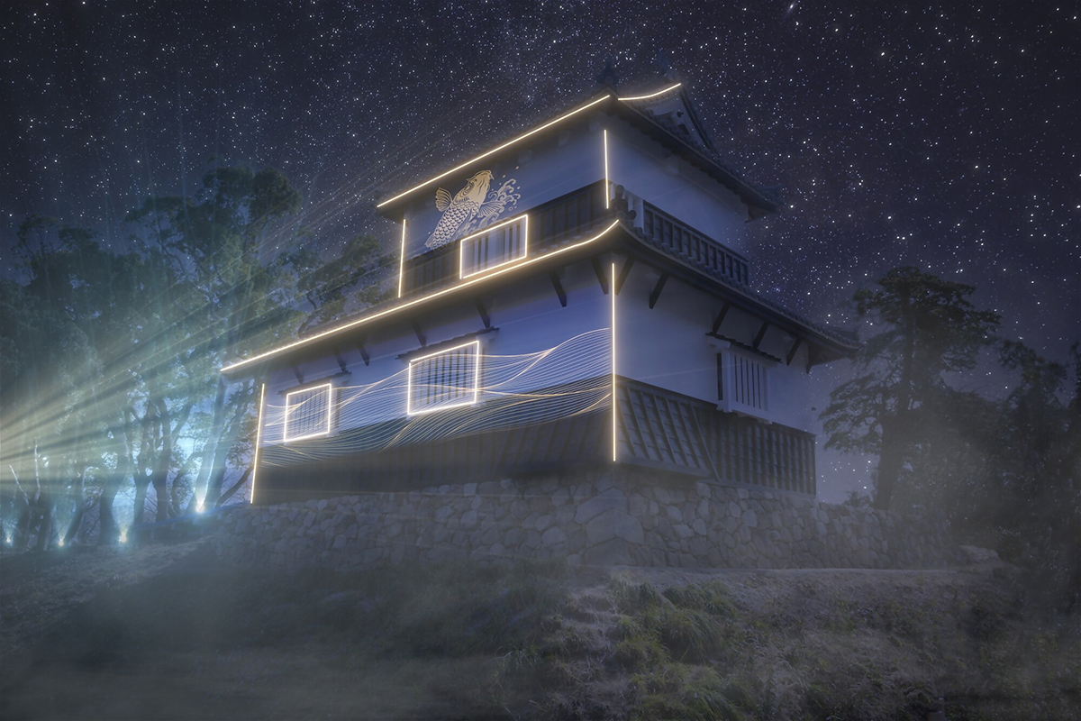 今年3月に復元されたばかりの潮見櫓では、レーザーとプロジェクションマッピングによる光と音のシンクロショーが行われます。