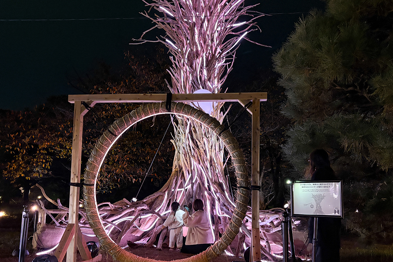 桜園の「呼応する御神木」では、入口で配布される提灯を茅の輪の先にある御神木にかざすと桜園全体のライトアップと連動する参加体験型の演出を楽しめます。