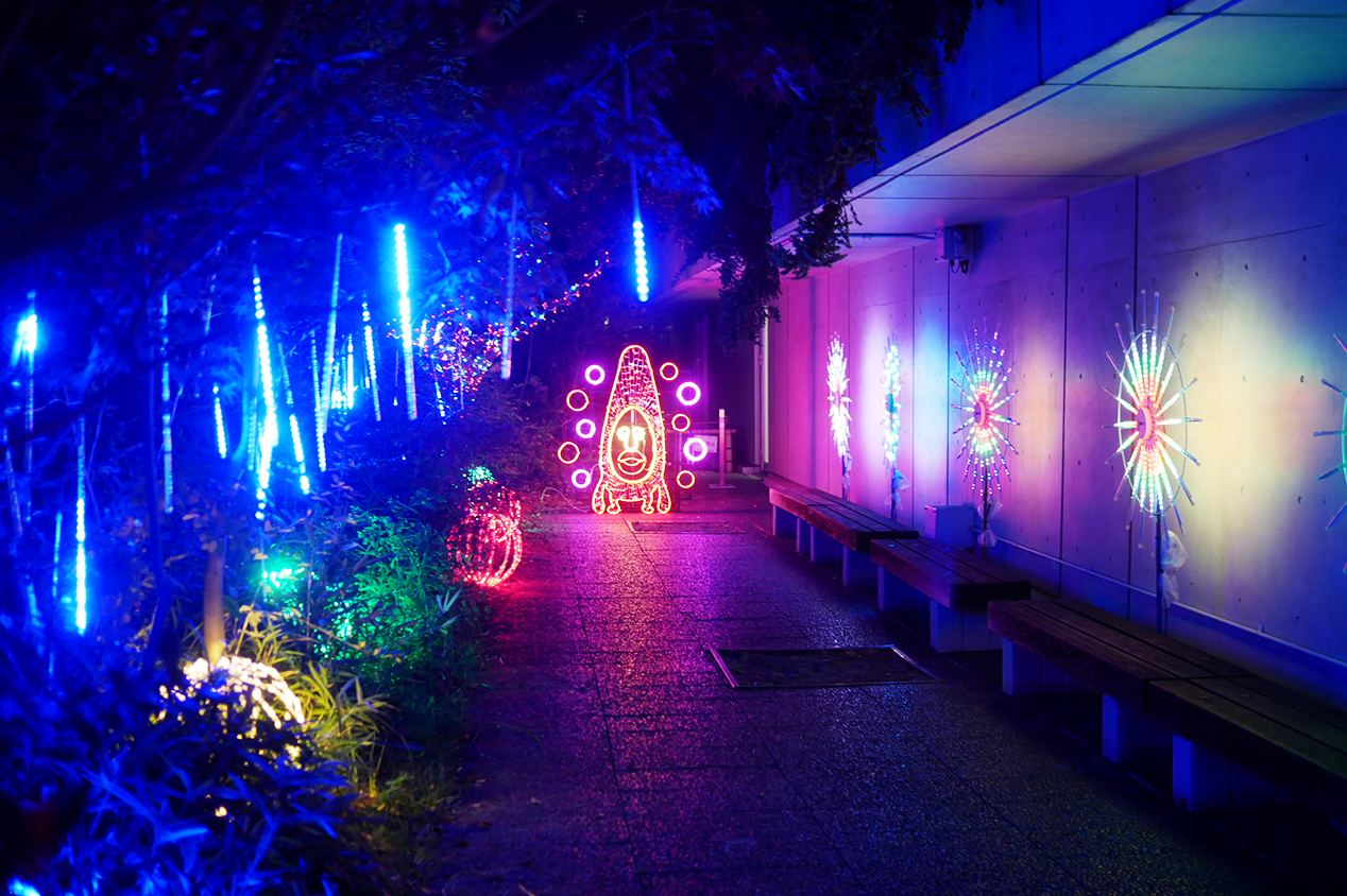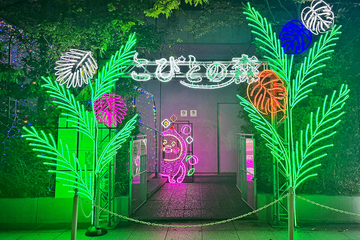 まもなく20周年を迎え、累計310万部を超える「こびとづかん」シリーズは、昆虫でも植物でもない不思議な生き物「コビト」が魅力の児童書。「カクレモモジリ」や「ホトケアカバネ」など人気のコビトたちが光り輝くイルミネーションになってステップガーデンに隠れています。